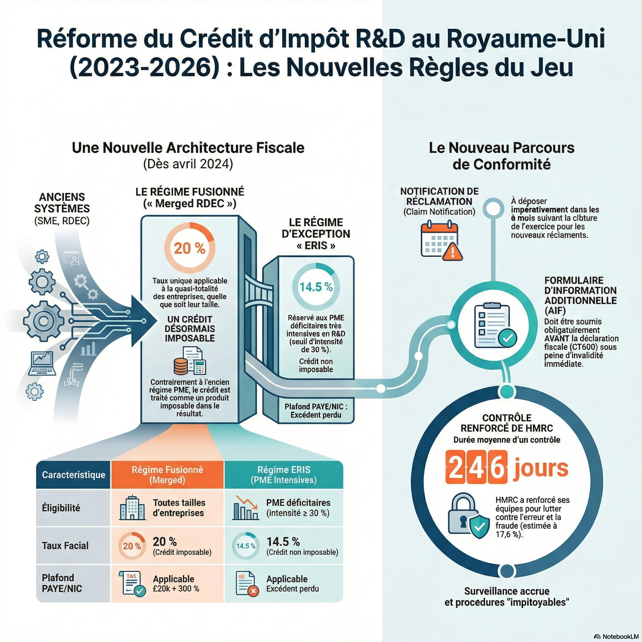 La fiscalité britannique de la R&D a été profondément refondue en deux vagues successives : une réforme « anti‑fraude/anti‑erreur » entrée en vigueur à partir d’avril 2023 et d’août 2023 (notification préalable, formulaire d’informations additionnelles, exigences de dépôt numérique), puis une réforme de structure à compter du 1er avril 2024 fusionnant les deux mécanismes historiques (SME R&D relief et RDEC) dans un régime fusionné de type RDEC applicable à la quasi‑totalité des entreprises, complété par un régime “ERIS” (Enhanced R&D Intensive Support) réservé aux PME déficitaires et “R&D‑intensives”.